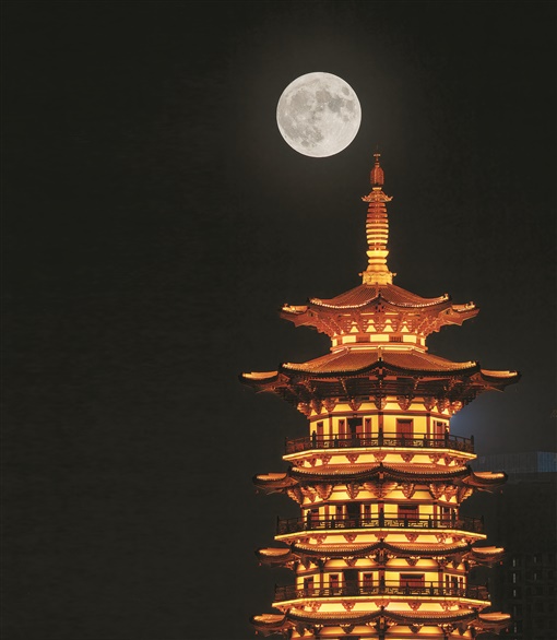 7月13日晚,長沙洋湖國家濕地公園,“超級月亮”與白鷺塔唯美同框。繼6月14日之后,“超級月亮”當天再次現身,這輪“超級月亮”是今年諸多滿月當中最大的一個。記者 辜鵬博 攝