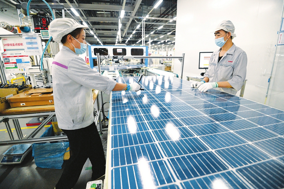 7月15日,大同隆基光伏科技有限公司光伏面板生產線上,工人們正在對產品進行最后檢測。該公司規劃布局了3條自動化生產線,引入目前行業內先進的生產設備和技術工藝。全部建成投產后,預計年產值約30億元。(記者李兆民攝)