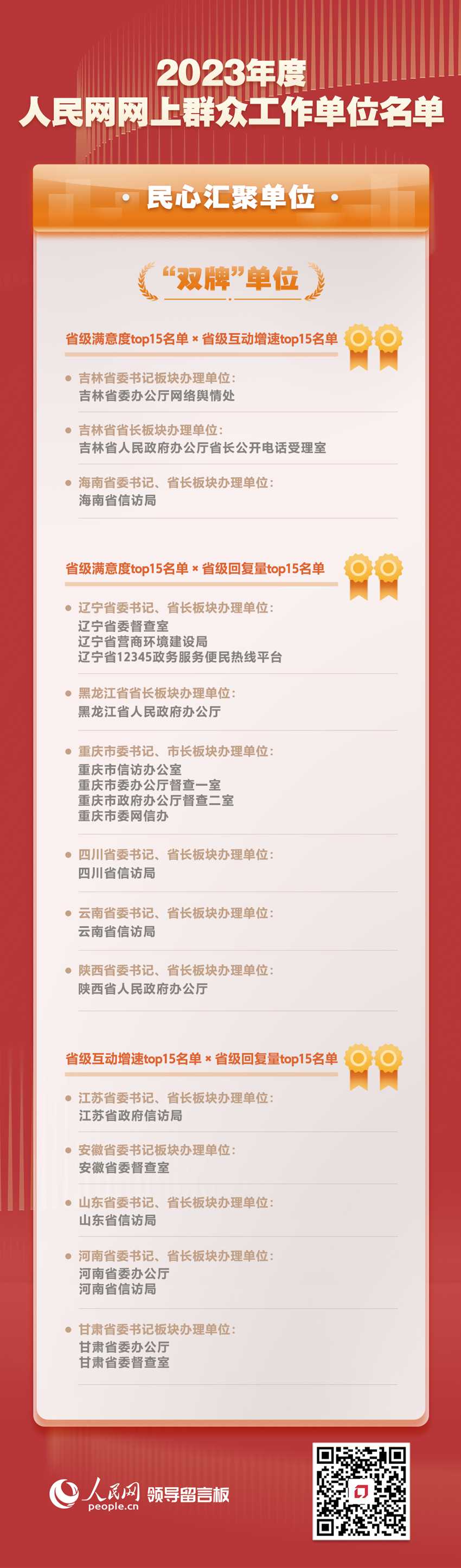 此次公布的名單綜合全國各地區各部門各單位近一年來的滿意度、互動增速、回復量等指數,著重突出各地區各部門各單位依托人民網“領導留言板”開展網上群眾工作情況,選出2023年度人民網網上群眾工作“民心匯聚單位”“實干擔當單位”“匯智為民單位”和“活力奮進單位”。