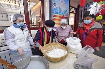 昨日,什剎海街道,居民在桂香村師傅的指導下學習手工搖元宵。新京報記者 王貴彬 攝