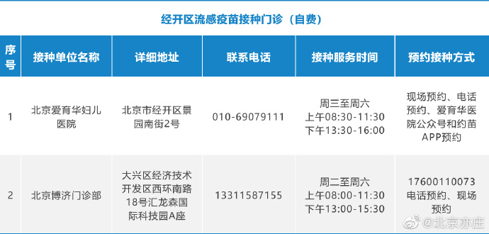 社會(huì)事業(yè)局相關(guān)負(fù)責(zé)人介紹,經(jīng)開區(qū)將繼續(xù)采用提前預(yù)約方式開展自費(fèi)流感疫苗接種工作。目前,經(jīng)開區(qū)共設(shè)立北京博濟(jì)門診部、北京愛育華婦兒醫(yī)院兩個(gè)流感疫苗接種服務(wù)點(diǎn),有接種需求的市民可提前向接種門診預(yù)約咨詢,可通過(guò)電話、現(xiàn)場(chǎng)登記、微信公眾號(hào)及其他網(wǎng)絡(luò)預(yù)約方式完成預(yù)約。