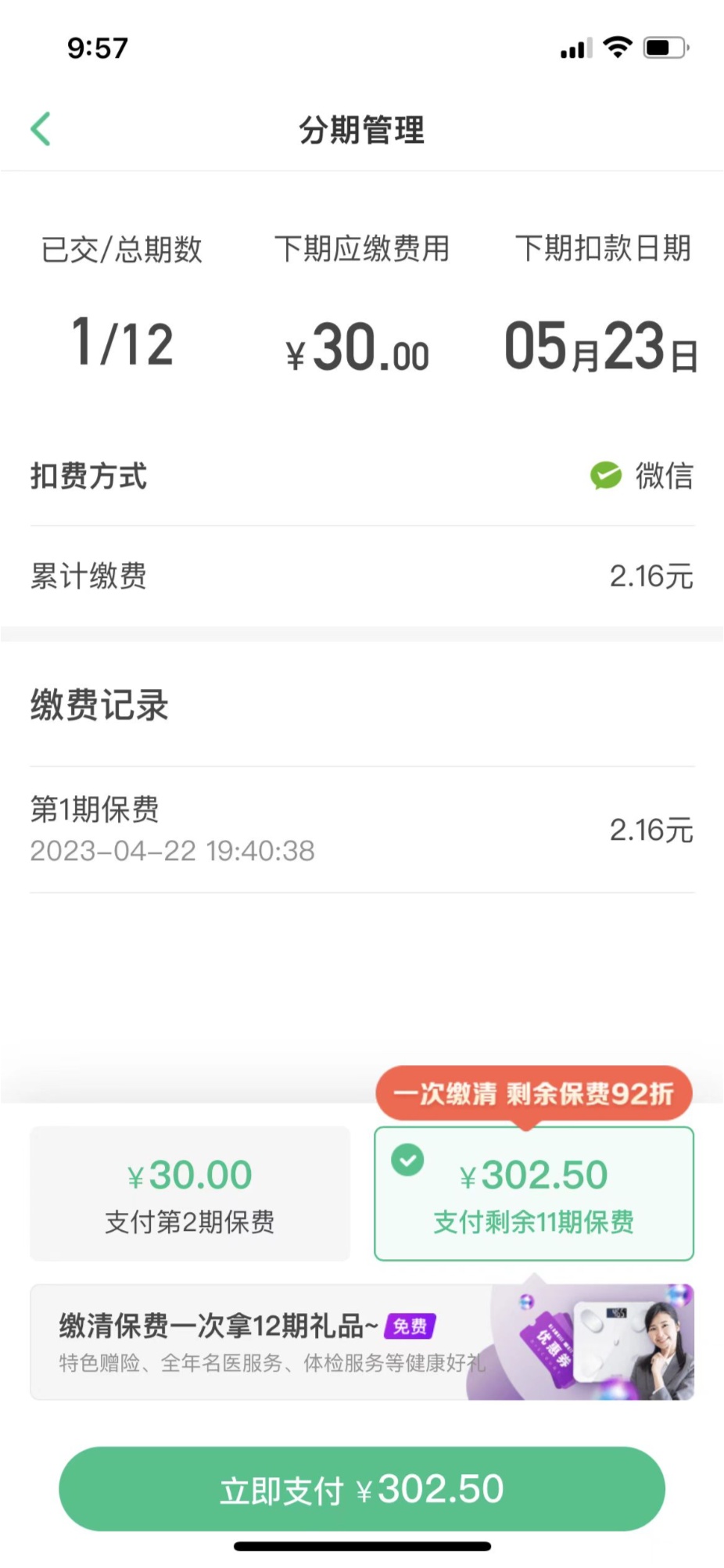 記者在眾安保險App的保單頁面中看到,所購保險名為“眾安百萬醫療保險2022版”,點擊保單頁中的“去繳費”選項,該保單為期一年,目前累計繳費2.16元,但下期應繳費用已變為30元。