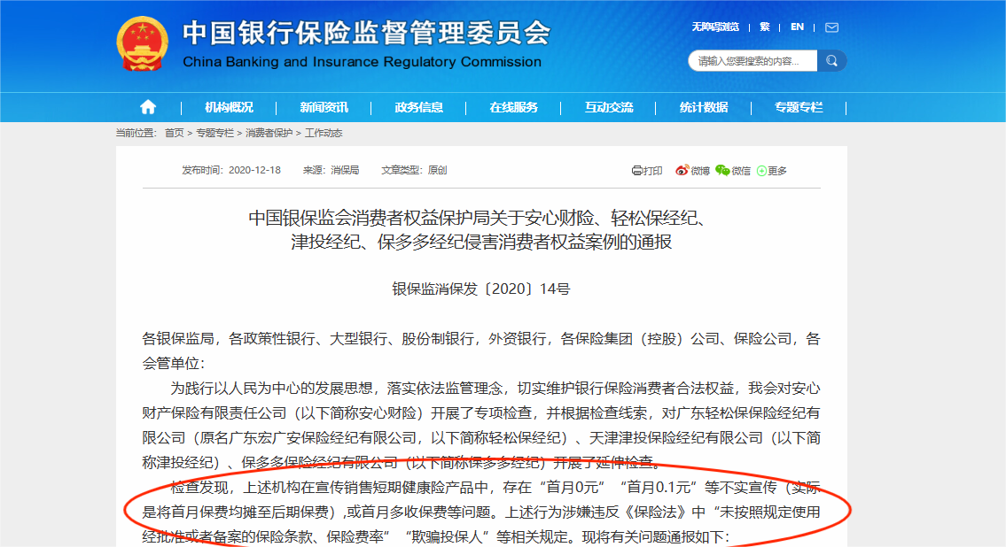 2020年,中國銀保監會消費者權益保護局發布關于安心財險、輕松保經紀、津投經紀、保多多經紀侵害消費者權益案例的通報。通報稱檢查發現,上述機構在宣傳銷售短期健康險產品中,存在“首月0元”“首月0.1元”等不實宣傳(實際是將首月保費均攤至后期保費),或首月多收保費等問題。上述行為涉嫌違反保險法中“未按照規定使用經批準或者備案的保險條款、保險費率”“欺騙投保人”等相關規定。