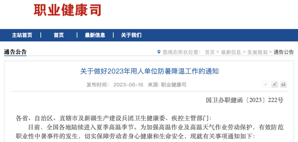 通知指出,目前,全國各地陸續(xù)進入夏季高溫季節(jié)。近年來,夏季高溫作業(yè)及高溫天氣作業(yè)導致勞動者中暑死亡的事件時有發(fā)生,對勞動者身心健康和生命安全造成嚴重威脅。各級衛(wèi)生健康行政部門和疾控主管部門要進一步明確工作責任,加強組織領導,系統(tǒng)謀劃部署,協(xié)同推進用人單位防暑降溫工作和各項職業(yè)病預防工作。