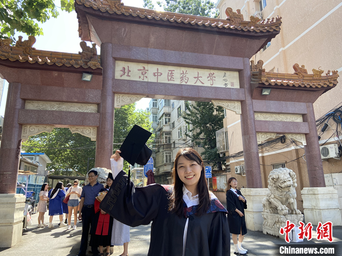 圖為劉沂柔在北京中醫藥大學校門前留影。 中新社發 受訪者供圖