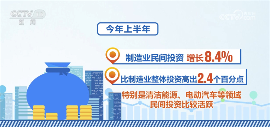 國家發(fā)展改革委相關負責人表示,當前,民間投資結構持續(xù)優(yōu)化,一些領域民間投資顯現了不少亮點。今年上半年,除房地產開發(fā)以外的民間投資同比增長9.4%,增速比全部投資高5.6個百分點;制造業(yè)民間投資增長8.4%,比制造業(yè)整體投資高出2.4個百分點,特別是清潔能源、電動汽車等領域民間投資比較活躍;基礎設施民間投資增長15.6%,比基礎設施整體投資高出8.4個百分點,呈現出較強的投資信心和投資動力。