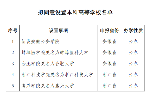 根據《中華人民共和國高等教育法》《普通高等學校設置暫行條例》《普通本科學校設置暫行規定》有關規定以及第八屆全國高等學校設置評議委員會考察評議結果,經教育部黨組會議審議,擬同意設置安徽公安學院等5所學校,現予公示。公示時間為2023年11月20日至11月24日。