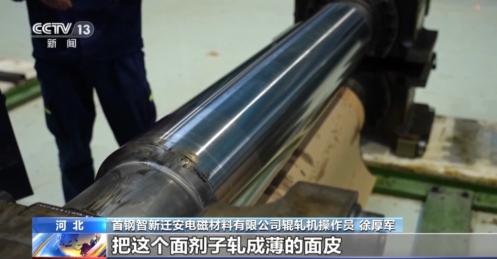 首鋼智新遷安電磁材料有限公司輥軋機操作員 徐厚軍:這就是軋制和帶鋼直接接觸的工作輥,如果說家里搟面的話,這就是我們的搟面杖。那個鋼鐵材料就相當于面劑子,我們就用這個搟面杖,通過擠壓,把這個面劑子軋成薄的面皮。6個搟面杖串起來,一遍就軋出來了。生產效率比傳統生產方法高了8倍到10倍,這條機組軋制速度是1500米每分鐘,相當于高速公路上以時速90公里開的小車一直在跑。