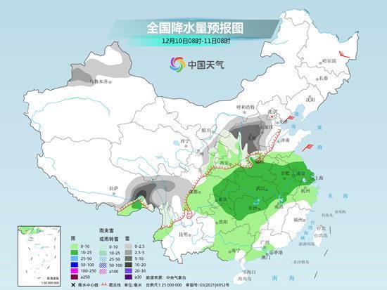 “預計12月10日開始,隨著暖濕氣流加強北上,與北方南下的冷空氣相結合,中東部地區將迎來大范圍雨雪天氣。”目前來看,10日至11日,華北、東北部分地區有小到中雪、局地大雪,黃淮北部、陜西北部有雨轉雨夾雪或雪,黃淮南部、江漢、江淮、江南、華南北部等地有小到中雨,局地大雨。