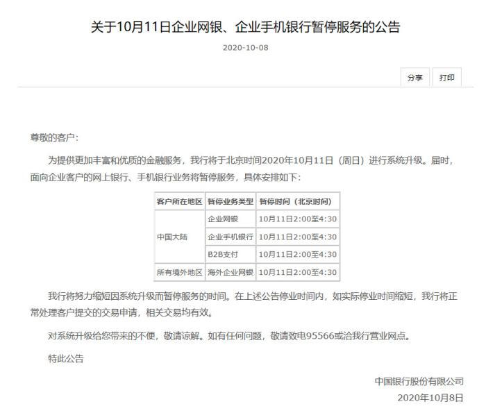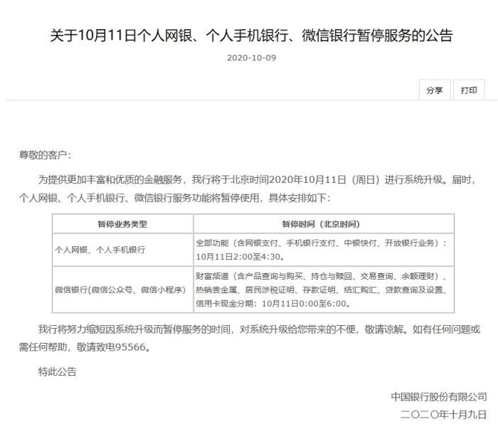 中新網客戶端10月10日電(彭婧如)近日,中國銀行先后發布《關于10月11日企業網銀、企業手機銀行暫停服務的公告》、《關于10月11日個人網銀、個人手機銀行、微信銀行暫停服務的公告》。根據公告,中國銀行將于北京時間2020年10月11日(周日)進行系統升級。屆時,面向企業客戶的網上銀行、手機銀行業務將暫停服務,個人網銀、個人手機銀行、微信銀行服務功能也將暫停使用。