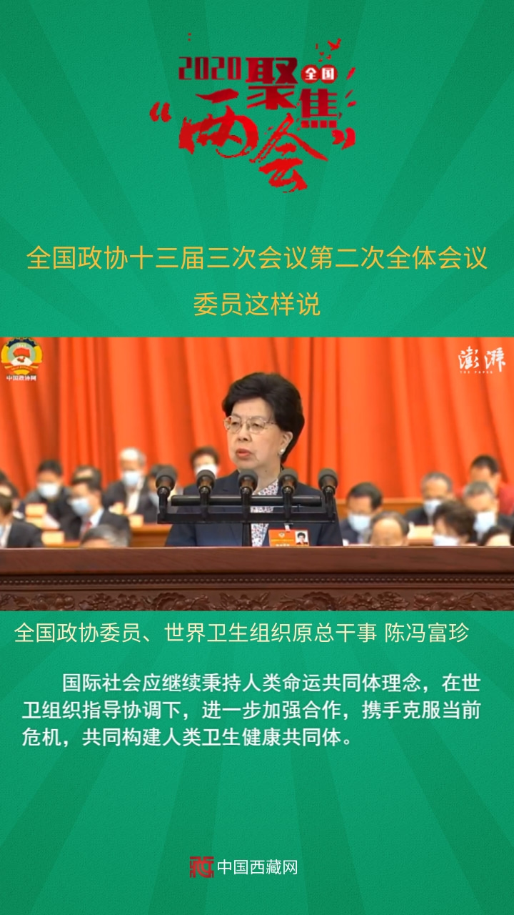 全國政協委員、世界衛生組織原總干事陳馮富珍發言說,國際社會應繼續秉持人類命運共同體理念,在世衛組織指導協調下,進一步加強合作,攜手克服當前危機,共同構建人類衛生健康共同體。