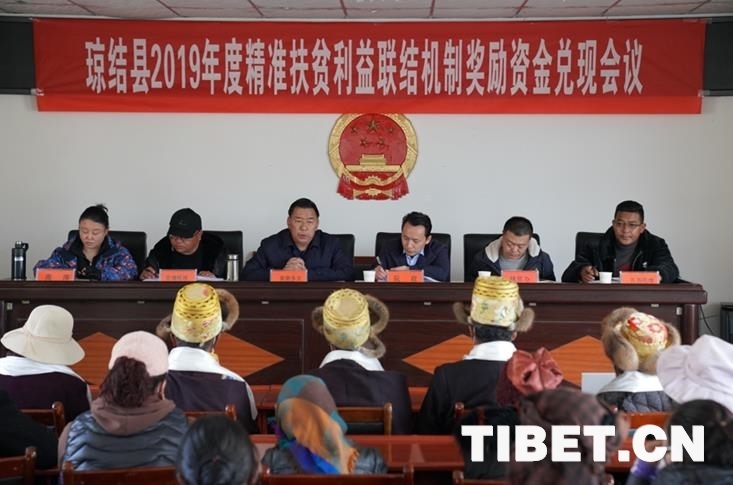 原來瓊結縣2019年度精準扶貧利益聯結機制獎勵資金兌現會正在瓊結縣瓊結鎮政府三樓會議室舉行。