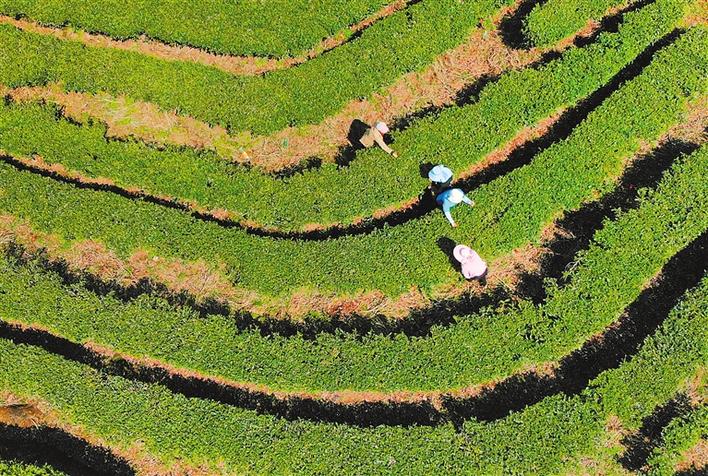 氣溫回暖,蟄伏了一個冬天的春茶早已迫不及待地吐出新綠。一片片小小的茶葉是村民手中的“金葉子”,一壟壟整齊的茶園成為當地群眾的“聚寶盆”,它們撐起了農民增收、農村富裕、脫貧攻堅的一方天地。