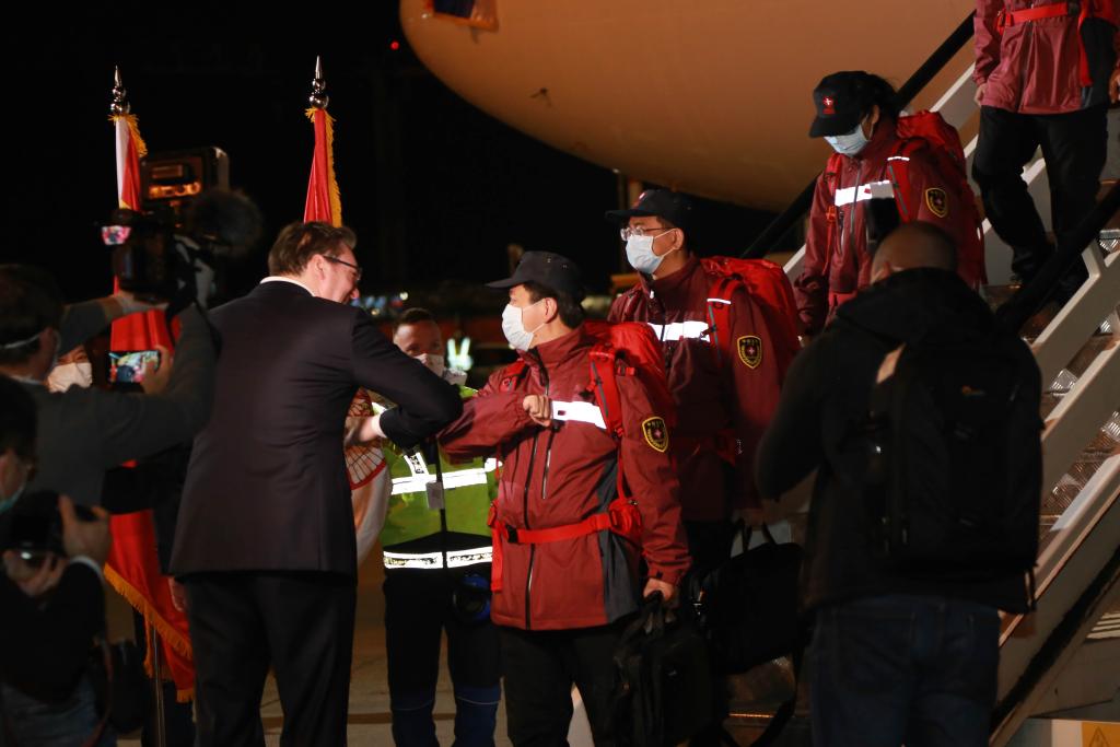 2020年3月21日,在塞爾維亞首都貝爾格萊德,前來迎接的塞爾維亞總統武契奇(左)與中國援助塞爾維亞抗疫醫療專家組成員“碰肘”致意。新華社記者石中玉攝