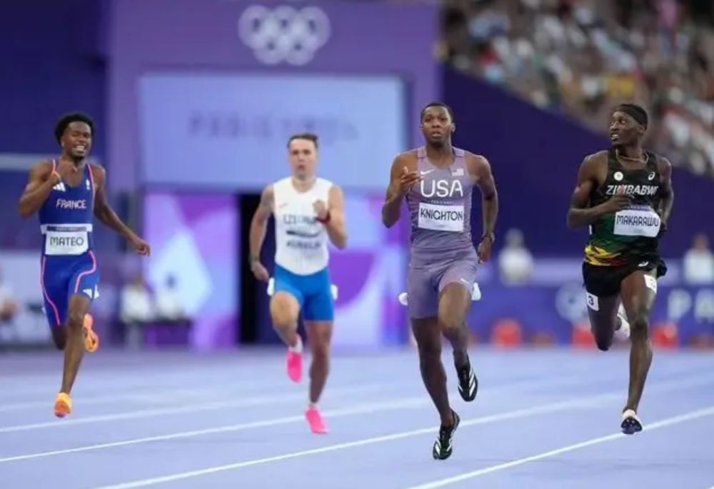 2024年8月5日,美國選手奈頓(右二)在比賽中。當日,巴黎奧運會田徑男子200米第一輪比賽在法蘭西體育場舉行。新華社記者 呂小煒 攝