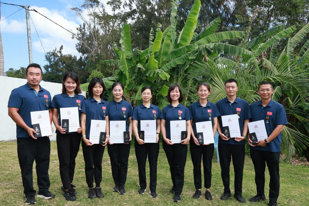 7月30日,在瓦努阿圖首都維拉港,中國援瓦醫療隊隊員手持證書合影。瓦努阿圖總統武羅巴拉武當天向中國醫療隊9名隊員頒發“國家勛章”,以表彰他們為提升瓦醫療衛生服務水平、鞏固瓦中兩國醫療衛生合作作出的卓越貢獻。新華社發(中國援瓦醫療隊供圖)