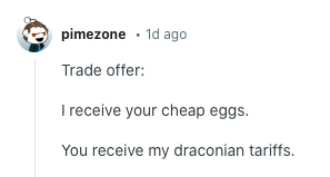 “這樣交易:我收你廉價雞蛋,你收我嚴厲關稅。”