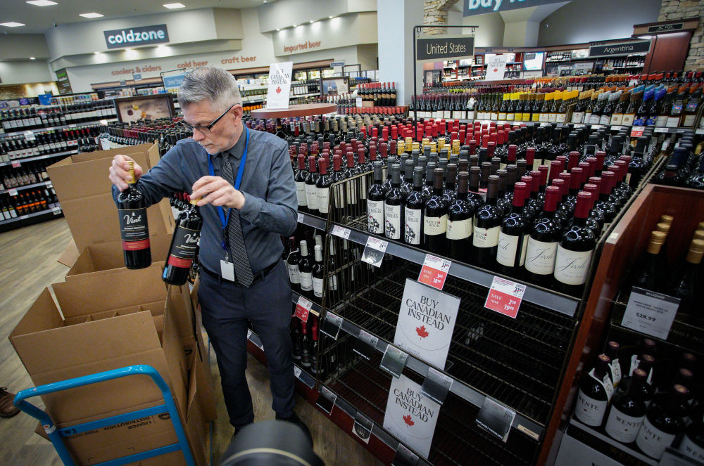 3月10日,在加拿大溫哥華,一家不列顛哥倫比亞省酒類專賣店的店員從貨架上撤下美國酒類產品。新華社發(梁森攝)