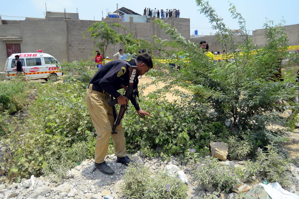 2025年5月8日,在巴基斯坦卡拉奇,安全人員檢查印度無人機襲擊現場附近區域。新華社發