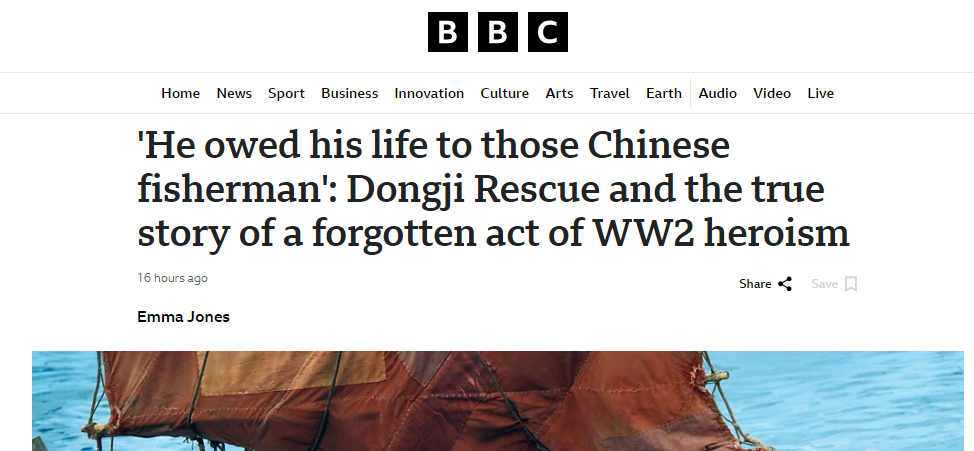 暑期檔電影《東極島》正在熱映,影片講述了1942年,一艘搭載英軍戰俘的船只在舟山群島附近被潛艇擊沉,上千名戰俘被封鎖在船艙內,命懸一線。危難之際,東極島上的漁民,不顧風高浪急與生命危險,毅然駛向深海救人的故事。近日,英國廣播公司網站發表一篇文章回顧了相關歷史事件,標題是《“他的生命歸功于中國漁民”:東極島救援與二戰中一段被塵封的英雄事跡》。