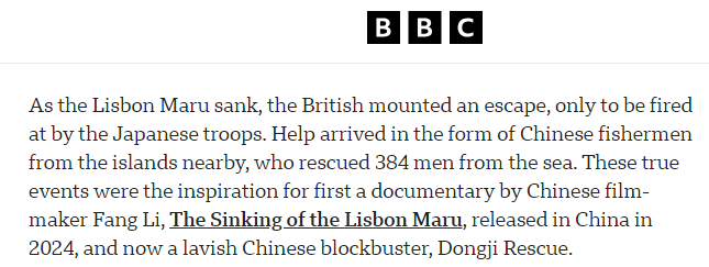 文章最后說,電影《東極島》將于8月22日在英國和美國上映;紀錄片《里斯本丸沉沒》目前正在英國通過奧德賽中文電影頻道網站播放,以紀念中國人民抗日戰爭暨世界反法西斯戰爭勝利80周年。