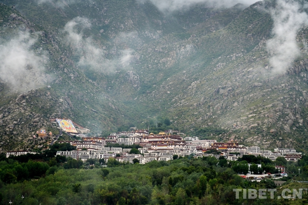 圖為遠眺哲蚌寺展佛與哲蚌寺全景 攝影:馮重霖