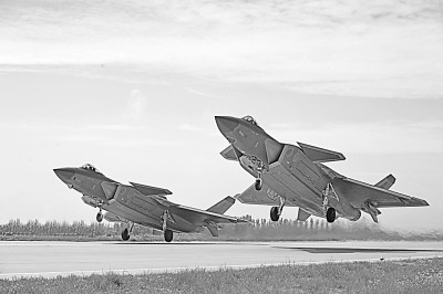 空軍“王海大隊”飛行員駕駛殲-20戰機編隊起飛。王鴻飛攝/光明圖片