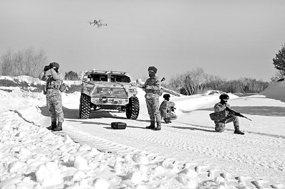 陸軍某旅三角山邊防連執勤組外出巡邏時使用無人機偵察。新華社發