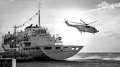 中國海軍“和平方舟”號醫院船靠泊所羅門群島霍尼亞拉港期間,艦載醫療救護直升機開展巡診服務。新華社發