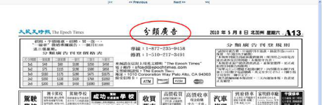 ▲《大紀元時報》的廣告專欄