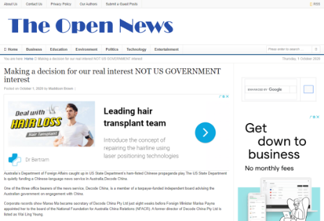 2020年10月1日,澳大利亞“透明新聞網”(Openthenews.com)登載專欄作家麥迪遜·布朗(Maddison Brown)文章指出,“法輪功”旗下“解碼中國”(“法輪功”外圍組織)通過澳洲反華智庫組織“澳大利亞戰略政策研究所”獲得美國國務院扶持資金。
