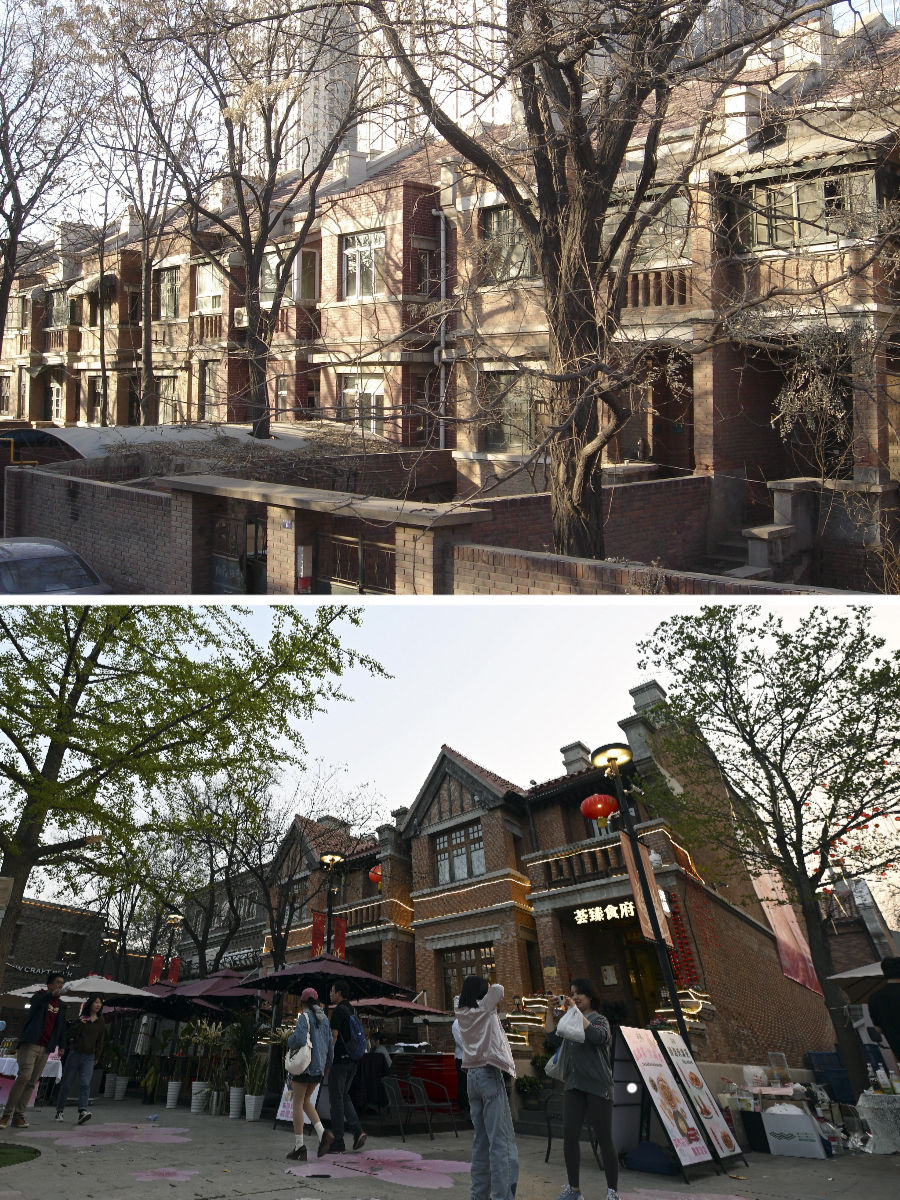 拼版照片:上圖是改造前的先農大院(資料照片)。下圖是游客在位于五大道的先農大院內游覽(4月6日攝)。始建于1925年的先農大院是五大道建成最早的建筑群之一,融合了英式聯排住宅、英式獨棟別墅等多種特色的建筑風格。歲月變遷,這些建筑一度損壞嚴重,配套設施老化。2006年起,天津啟動先農大院整理項目,對街區居民進行了騰遷,對建筑進行了加固修繕,恢復了街區的歷史原貌,引進了餐飲、文化展示、辦公等業態,使這里形成了環境優雅的公共藝術和展示建筑遺產的城市新空間。