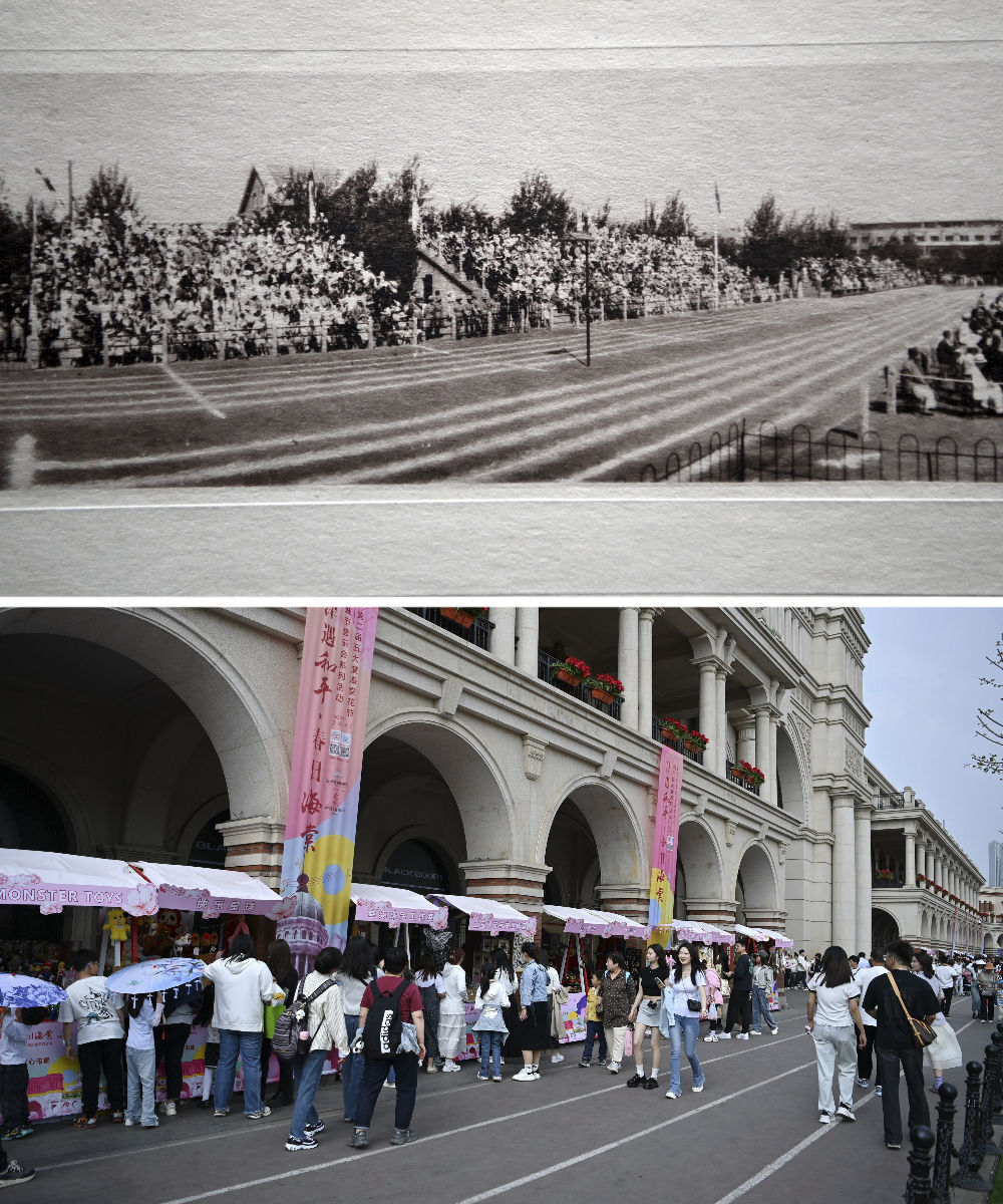拼版照片:上圖是位于五大道的民園體育場(資料照片);下圖是位于五大道的民園廣場(4月6日攝)。民園廣場的前身是始建于1920年的民園體育場,這里也是中國的第一個燈光足球場。經過提升改造,現在的民園廣場已經成為中西合璧的“城市會客廳”。
