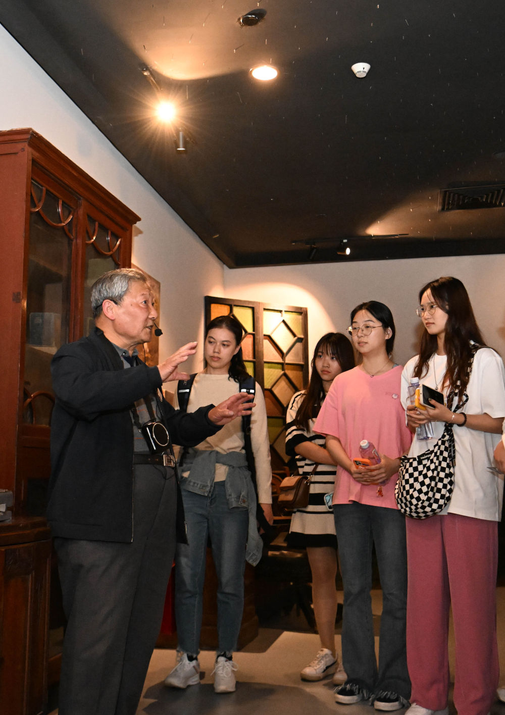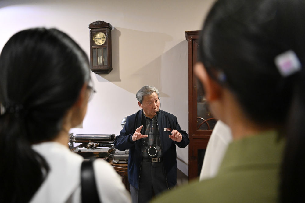 金彭育(中)在五大道歷史博物館免費給游客講解(4月13日攝)。
