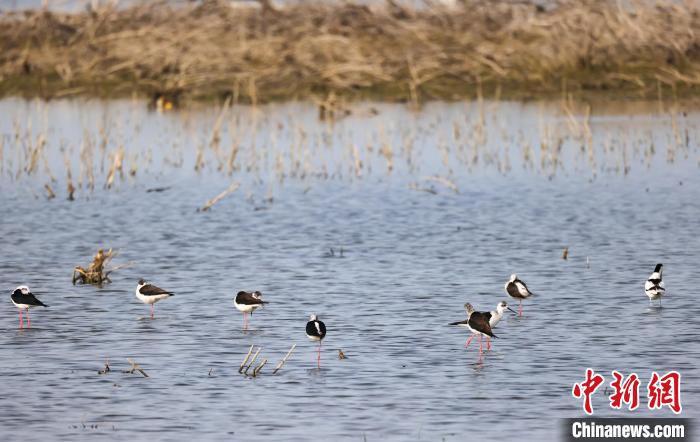 黑翅長腳鷸喜歡成群結隊,以小昆蟲、小魚等為食,對生存環境要求高,喜歡棲息于開闊平原草地中的湖泊、淺水塘和沼澤地帶。它們是水生環境變化的指示性動物之一,具有重要的生態價值,它們的出現是當地生態環境日益改善的有力見證。