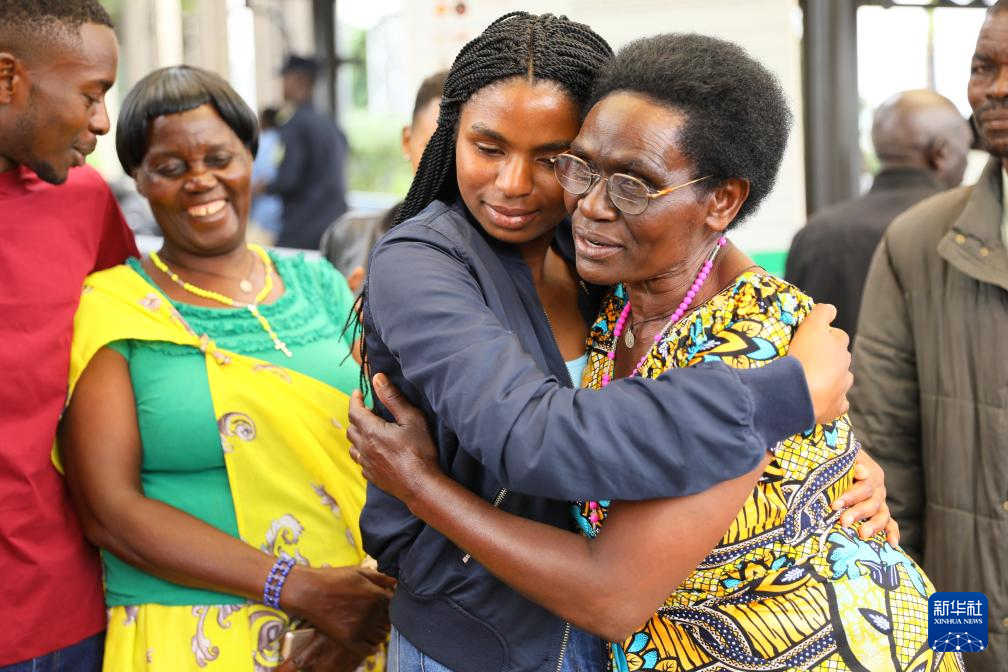 4月23日,在盧旺達首都基加利國際機場,一名來自盧旺達北方省穆桑澤職業技術學院的學生與母親擁抱告別。新華社記者 吉莉 攝