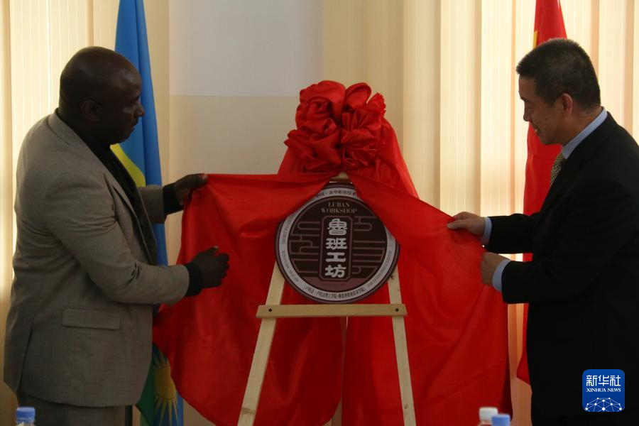 2023年11月18日,在盧旺達北方省穆桑澤職業技術學院,中國駐盧旺達大使王雪坤(右)與盧旺達北方省省長莫里斯·穆加博瓦加洪德共同為盧旺達魯班工坊揭牌。新華社發(黃萬晴攝)