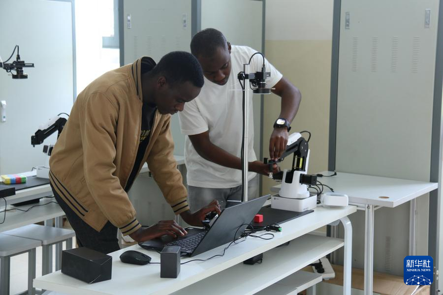 2023年11月18日,在盧旺達北方省穆桑澤職業技術學院魯班工坊的實驗室中,兩名當地學生操作儀器。新華社發(黃萬晴攝)