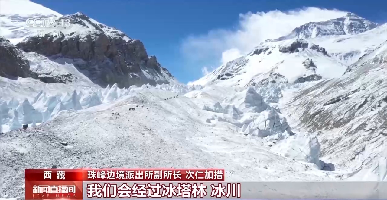 珠峰邊境派出所副所長 次仁加措:往里走的話我們會經過冰塔林、冰川,穿越碎石灘,整個路途我們會花費8到12個小時,途中經過老大本營,那個地方是最危險的路段。