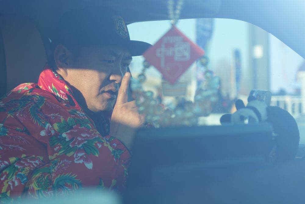 “左右哥”在車內接受視頻連線采訪(2024年1月9日攝)。新華社記者 張啟明 攝