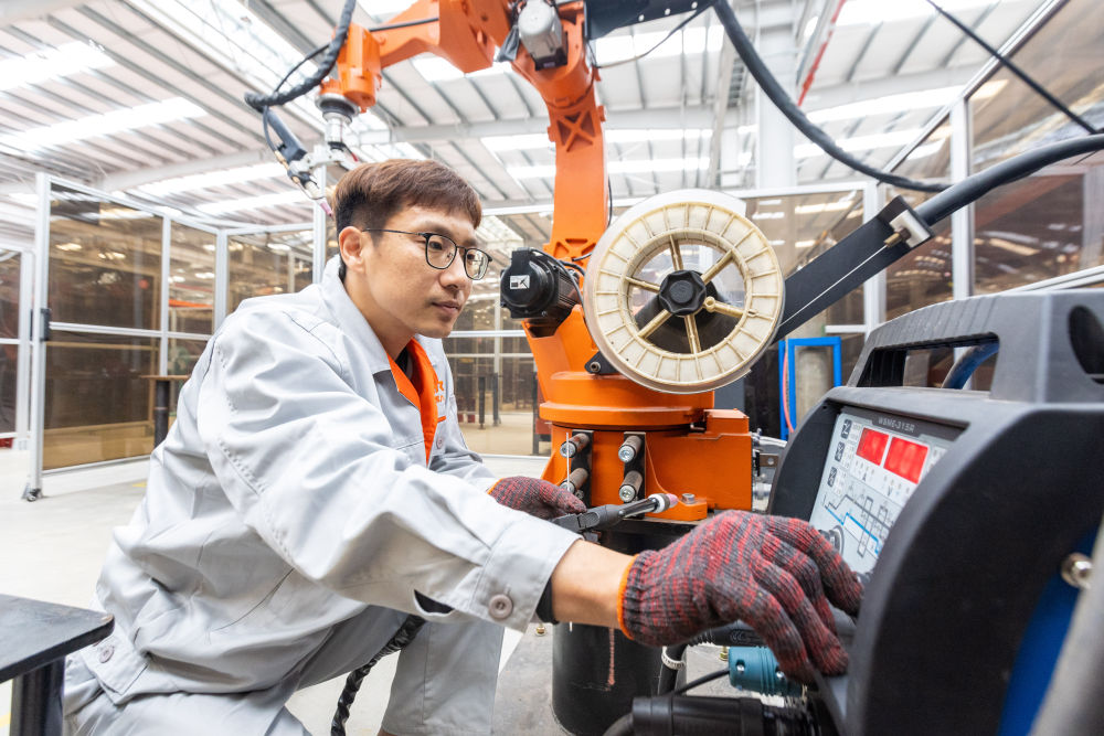 4月23日,在浙江錢江機器人有限公司車間,王洋在調整電焊機的參數。新華社發(溫嶺市委宣傳部供圖)