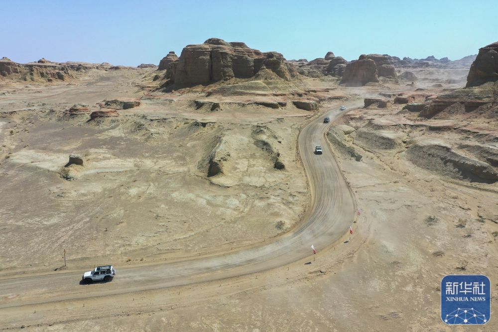 在新疆克拉瑪依市烏爾禾區世界魔鬼城景區,車友在自駕線路上疾馳(5月1日攝,無人機照片)。