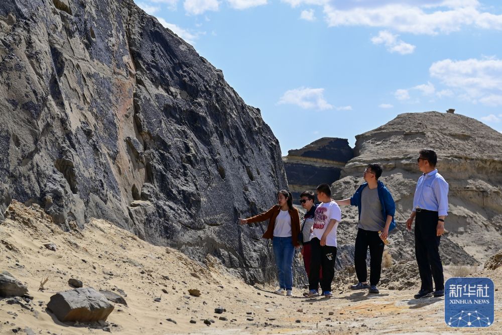 在新疆克拉瑪依市烏爾禾區,游客在天然瀝青礦參觀游覽(5月1日攝)。