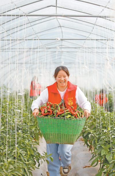 福建省南安市金淘鎮(zhèn)的蔬菜基地內,晨光村網(wǎng)格員幫助農(nóng)戶搬運采摘下的辣椒。 謝貴明攝(影像中國)