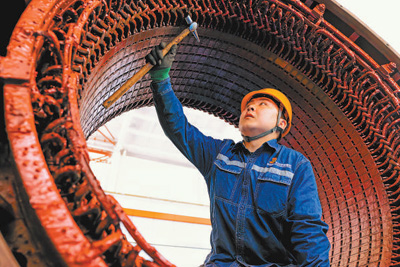 在包(頭)神(木)鐵路機務分公司東勝檢修設備車間,青年職工正對機車主發(fā)電機部件進行質量檢查。 張 棖 李尚昆攝影報道