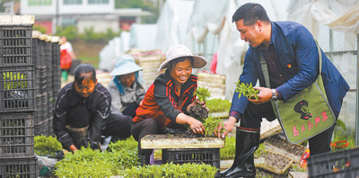 貴州省黔西市雨朵鎮(zhèn)小水井村駐村第一書記符蘭平(右一)向村民了解生產(chǎn)情況。 周訓超攝(人民視覺)