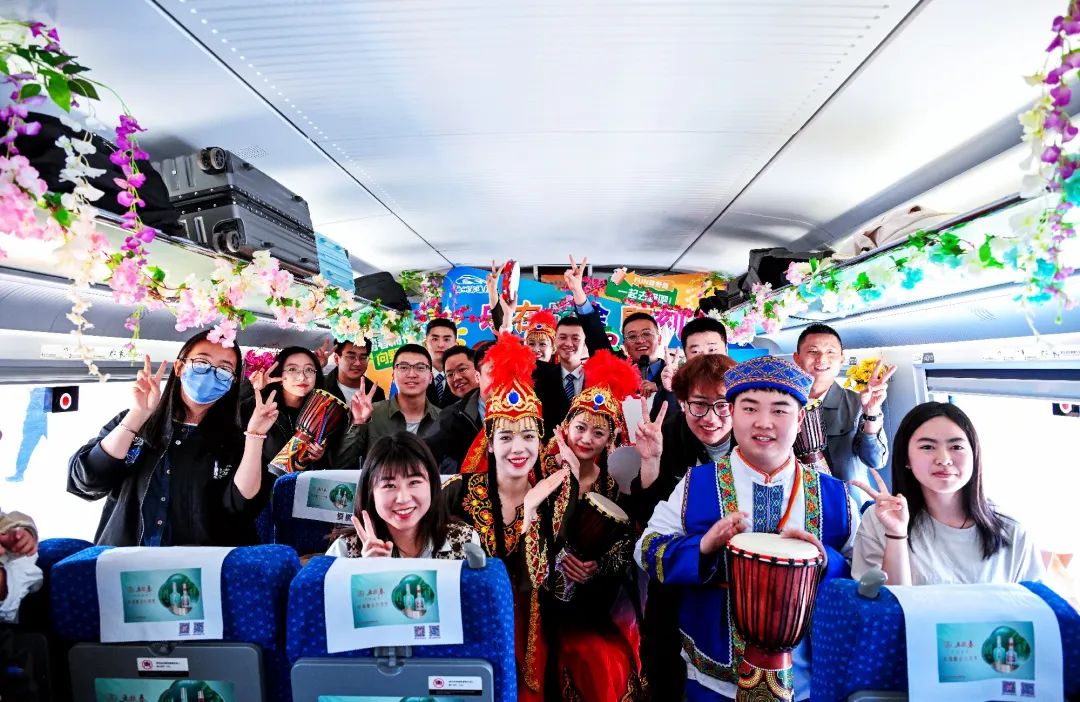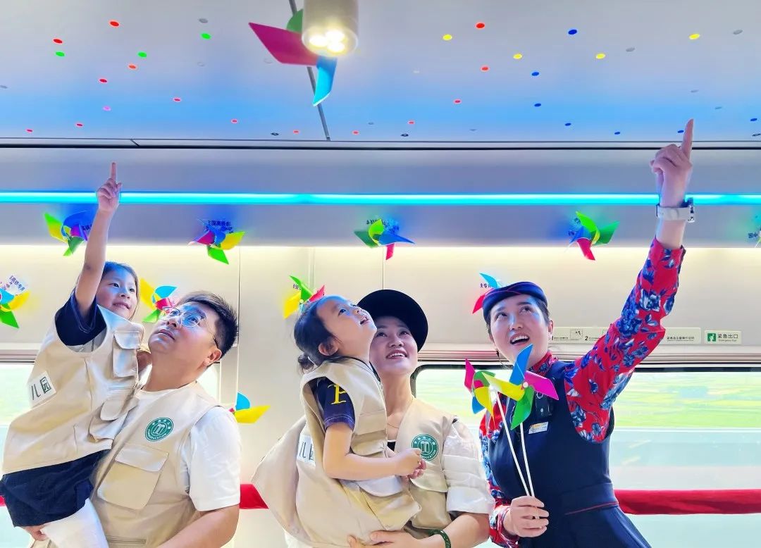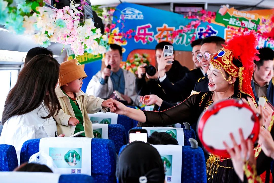 蘭州局集團公司在G1876次列車上舉辦“樂在旅途 即刻出發”主題秀,用錦簇花團裝飾列車,乘務員載歌載舞與旅客熱情互動,豐富旅客假期出行體驗。
