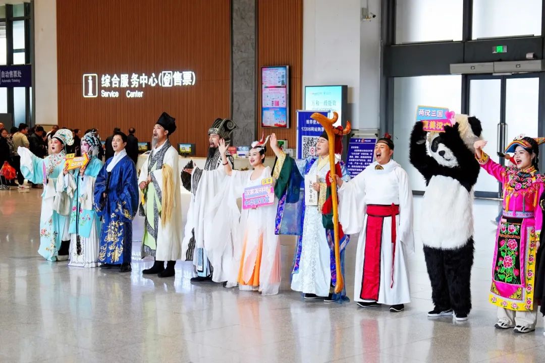 西安局集團公司與地方文旅局對接,組織張騫、劉邦、蔡倫等歷史文化名人及秦嶺四寶人偶、非遺漢調桄桄戲和羌族服飾演員組成的文旅IP在漢中站開展特色迎賓活動,在互動中引導旅客文明出行,展示地域文化。