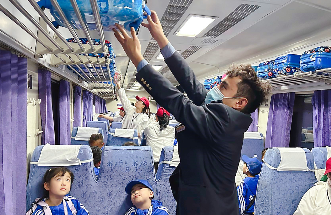 開車后,列車長蔣耀第一時間和帶隊老師溝通、了解情況,帶隊老師說他們一共有53名小學生、8名老師,從吐魯番“研學”結束乘坐火車返回庫爾勒。蔣耀給帶隊老師講解了兒童乘車安全注意事項,又叮囑他們在旅行期間如遇困難可以找他或乘務員幫助。