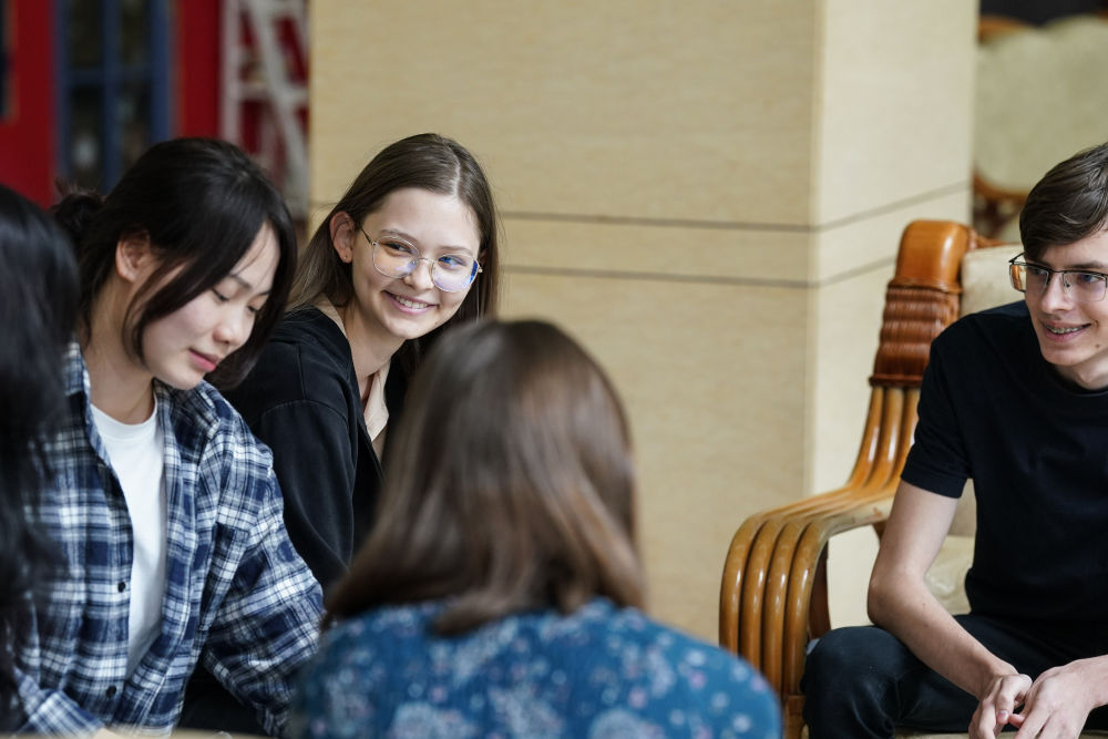 宋智孝(左二)在北京首都師范大學校園內與同學交流(2024年4月28日攝)。